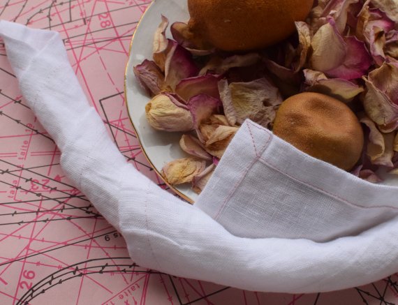 Itse käytin 100 % kivipestyä pellavaa, jota tarvitsin 221,5 leveän ja 266,5 senttiä pitkän palan.