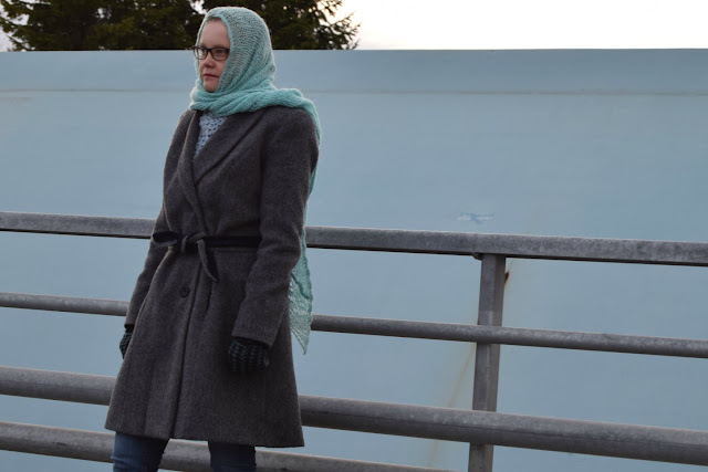 Kaapista sattui silmiini virkkaamani kaulahuivi, jossa on mielestäni riittävästi välkettä tuleviin syksyn aamuihin. Hyvin näkyi kuvissa kaulahuivi sointuvan takkiin. Vaaleanvihreästä huivista voi olla sitten montaa mieltä. Sellaista elämä on, että vanhat lentokenttälöydötkin on hyödynnettävä, ja asusteet eivät voi aina olla sävy sävyyn.