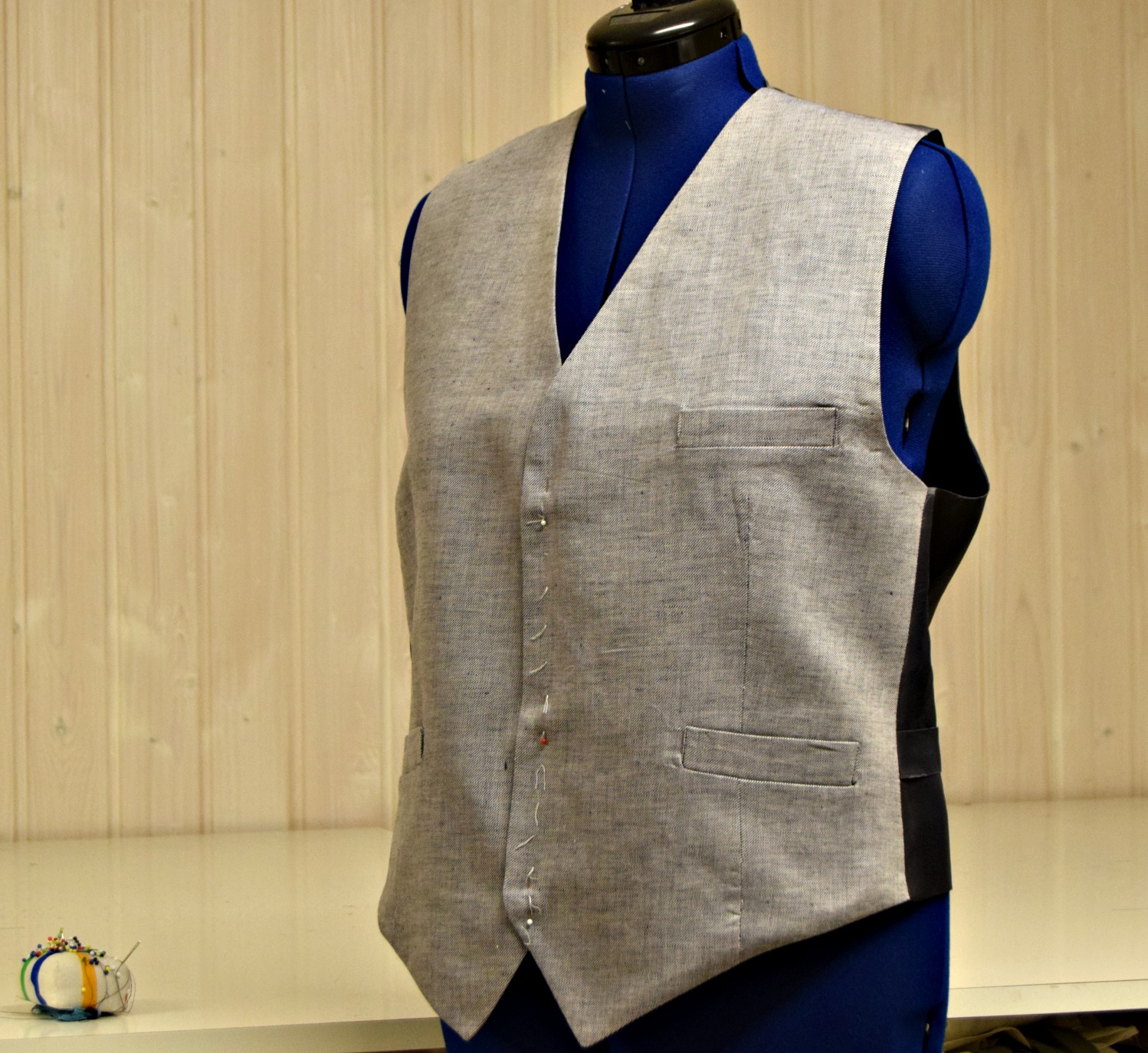 Niinpä sitten surautin komeamman osapuolen liivin valmiiksi. Napit ja napinlävet uupuvat vielä, mutta ne lisään sitten sovituksen jälkeen. Ohessa siis tuoreet kuvat. Olettaen, että liivi mahtuu päälle, niin sovituskuvia tulee, kun mies ja kamera kohtaavat.