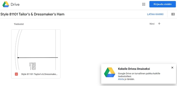 Jaan Omin mitoin™ -kaavat sinulle Google Drive -kansiosta, jonne pääset klikkaamalla kaavasivulla olevaa linkkiä esim. ”Style 81101 Silityskinkku”. ”Linkki ohjeeseen” vie sinut puolestaan postaukseen, johon olen kirjoittanut tarinaa kaavojen takaa ja ohjeen projektin tekemiseen. Linkki vie sinut kansioon, josta pääset tulostaman kaavan ilman kirjautumista. Kun klikkaat tiedoston auki, niin voit tulostaa avautuvan tiedoston joko heti tai ladata sen koneellesi myöhempää käyttöä varten.