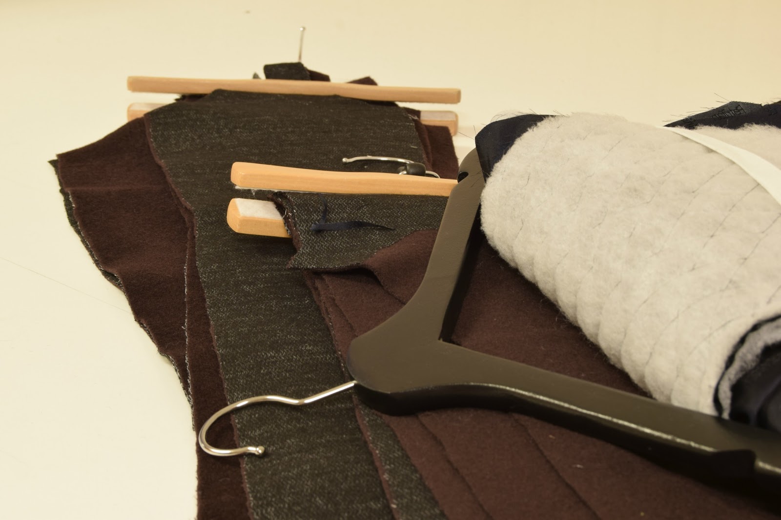 Ompelin pukupussin kaapistani löytyneestä nallekankaasta ja se on palvellut tehtävässään hyvin kahvipesusta huolimatta (KLIK). Pukupussin sisällä laitettava henkari toimii varsin hyvin, jos vaatteiden olkasaumat on ommeltu. Vielä irtonaiset kappaleet eivät henkarilla pysy vaan löytävät tiensä pussin pohjalle. Aikana asiaa pähkäiltyä hoksasin, että parhaiten irtopalat pysyvät kasassa housuille tarkoitetuissa henkareissa tai kuminauhalla vyötettynä.