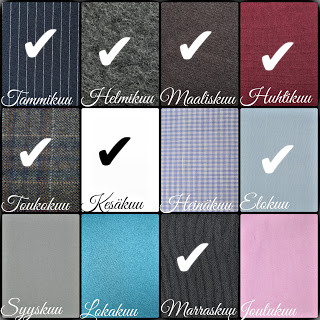 Viininpunainen huhtikuu taitteli nutturan tiukalle ja toi puvustoon trikoopuseron toukokuussa KLIK). Vihertävän/kellertävä toukokuu valmistui hameeksi kesäkuussa (KLIK). Valkoisesta kesäkuusta tuli mustavalkoinen heinäkuu (KLIK). Vaaleansininen elokuu toi puvustoon puseron (KLIK). Pikkumusta nahkamekko valmistui marraskuussa ja pinkkikin voimistui punaiseksi KLIK).
