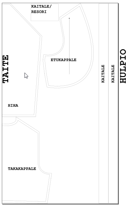 - kaksi resoria hihansuuhun, leikattavan kaitaleen (resorin) leveys on ranteen ympäryksesi-1 + saumanvarat. Mallivaatteen kaitaleen korkeus oli 9 cm.