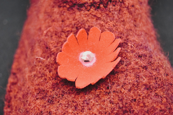 Kuvassa on punainen tossu, jossa on punainen kukka nahasta.