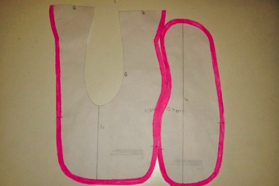 Jos leikkaat tossujen pohjaan erillisen vahvikkeen,leikkaa se senttiä tai puoltatoista pienemmäksi kuin varsinaisen tossujen pohja. Toinen vaihtoehto on leikata numeroa pienemmän tossun pohjakaavalla.