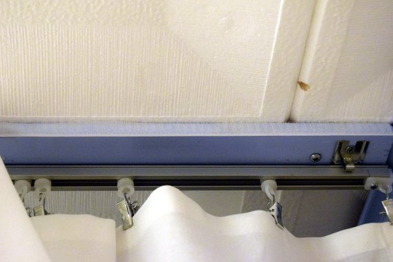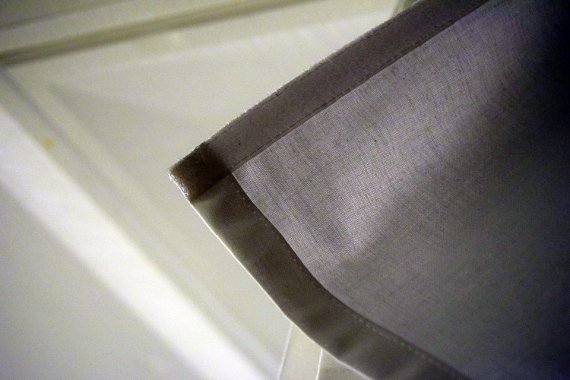 | Tarranauhan toinen puoli verhon yläreunaan. Nauha olisi varmaan pysynyt pelkällä liimalla, mutta ompelin nauhan kiinni |