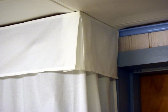 | Tarranauhan toinen puoli verhon yläreunaan. Nauha olisi varmaan pysynyt pelkällä liimalla, mutta ompelin nauhan kiinni |