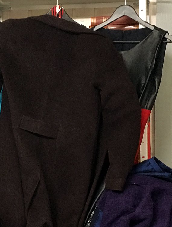 Siinä sitten torstai-iltapäivänä istuin, särkylääkkeen voimalla, ateljeen lattialla ja lajittelin vaatteita. Vaatteet hakeutuivat poisheitettäviin ja pidettäviin. Varkain pidettävien pino jakaantui takaisin kaappiin ja tuunattaviin. Pidettävissä huomasin enemmän kiintyneeni kotelomekkoihin (KLIK), vaikka jakkuja (KLIK, KLIK) tehdessä oli vierähtänyt tunti jos toinenkin.