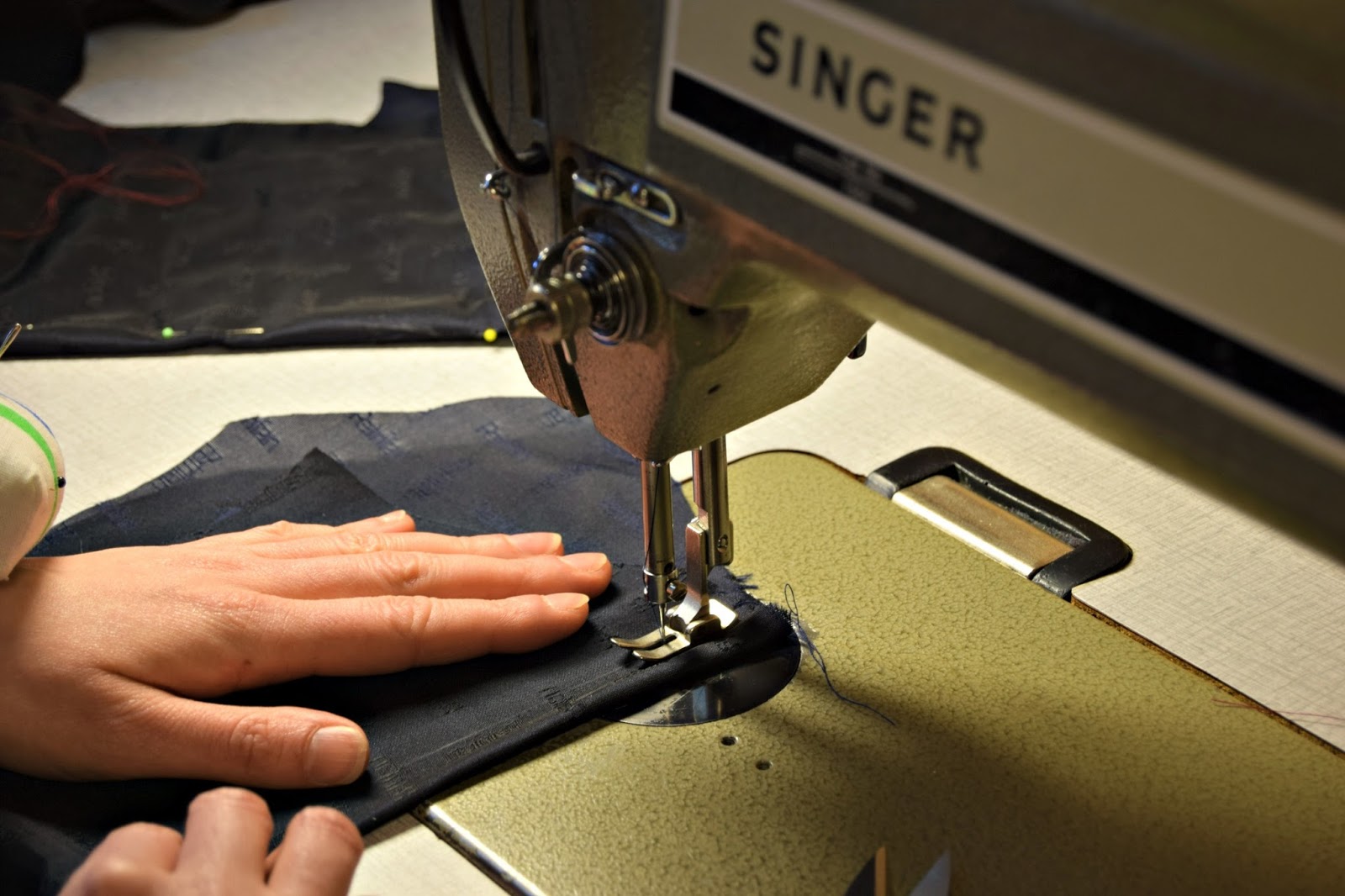 Kun toimin Singerin kanssa, niin jännitystä aiheuttaa se, että millä vauhdilla rouva liikkuu ja kerkiääkö ompelijatar mukaan. Tässä meidän 50-luvun Singerissä jo moottorin käynnistymisestä kertova humina kehottaa pitämään sormet neulasta etäällä, sillä kohta mennään. Hyvin painavan kaasujalan kanssa käy niin, että tikki tuli, kangas meni ja sormet siinä samassa.