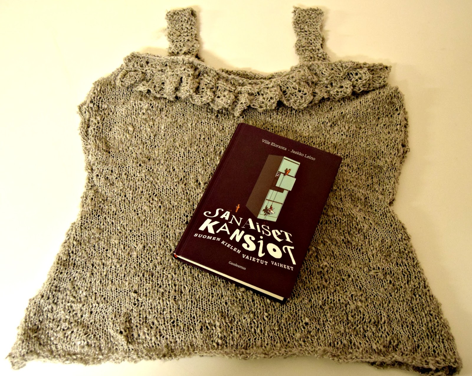Hyväkin kirja loppuu aikanaan. Ja sitten se iski neuloosi. Kaivelin kätköistäni puolivalmiin terapiatoppini ja antauduin puikkojen vietäväksi. Ihan putkeen ei mennyt tämäkään projekti, sillä onnistuin hävittämään alkuperäisen ohjeen pitsineuleeseen.