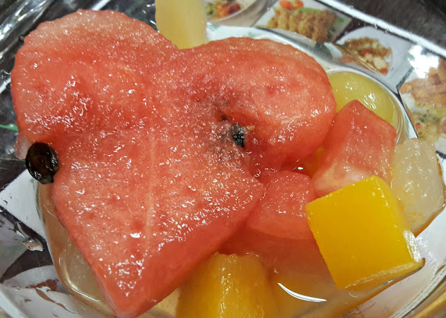 Ei pettänyt Mrs. Asia tälläkään kertaan. Iloisesti, yllättyneenä katselin, kuinka sydämellinen vesimeloni hedelmäsalaatissa toivotti hyvää ystävänpäivää.