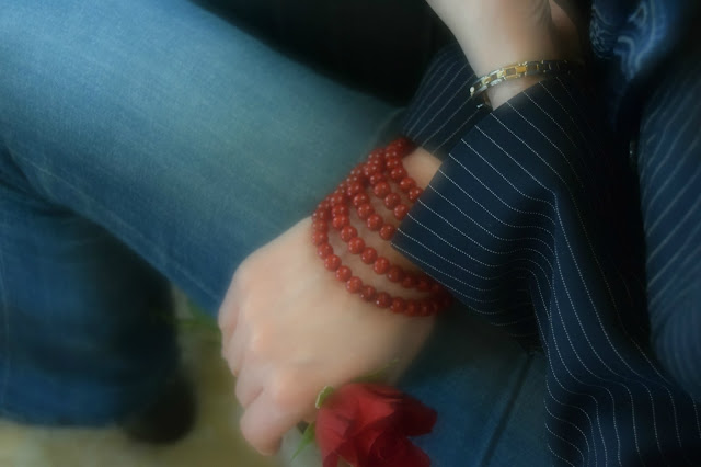 Stailaamista on harjoiteltava, ennen kuin uusi vaate luontevasti sujahtaa osaksi peruspuvustoa. Jo tammikuussa pyörähdimme äidin kanssa Joensuun Taitokorttelissa. Rakastuin ensisilmäyksellä Sinisessä Kammarissa myynnissä olleeseen rannekoruun – punainen väri suorastaan vietteli katseeni.