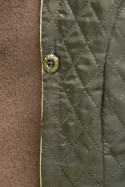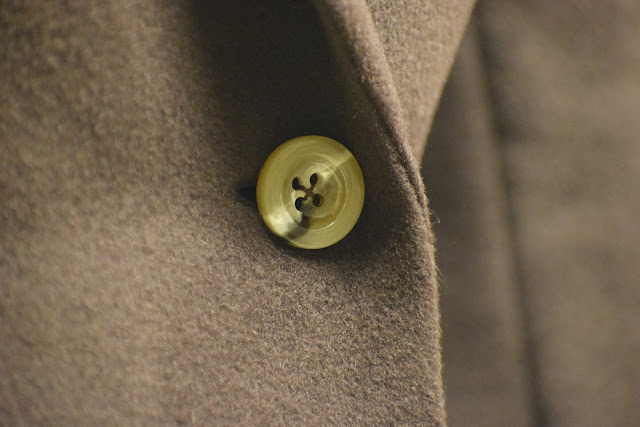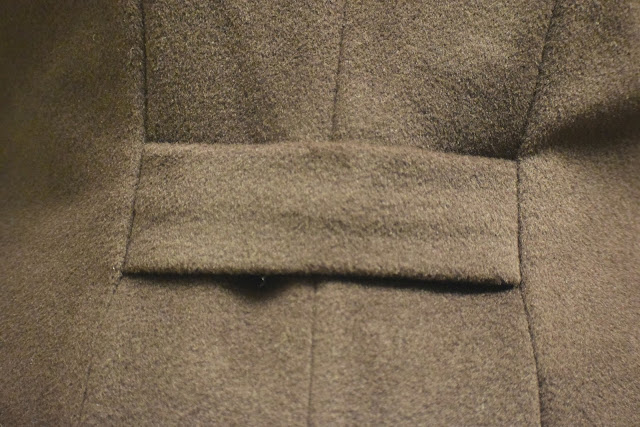 Haaveilin alun perin nilkkapituista takkia, mutta vuosia sitten ostettu villakangas asetti oman rajoituksensa. Pituus jäi hieman polven alle, kiinnitys näytti paremmalla yhdellä napilla ja takin taakse tarvittiin tamppi. Tamppi on sekä osa designia että kätevä tapaa piilottaa keskitakakappaleen vyötärösauma. Sauman tarvitsin, jotta sain kankaan hyödynnettyä parhaiten. Lisäksi takissa on tikkikankaasta valmistettu irtovuori.