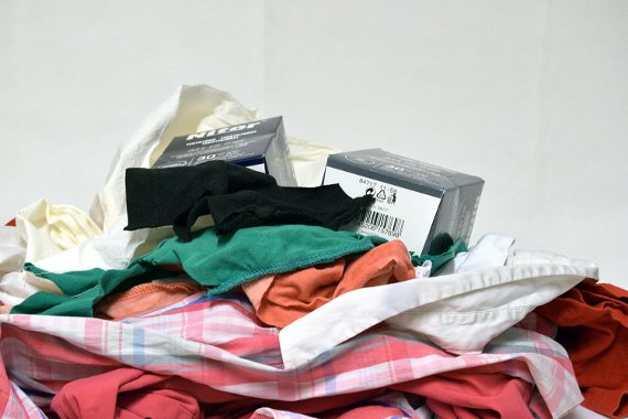 Tässä on hyvä esimerkki siitä, että kaikki kankaat ovat samaa värjäyserää. Värinvaihtelu johtuu kankaan koostumuksesta mitä enemmän tekokuitua, sitä vaaleampi on väri. Vaalein sininen kaitale oli täysin valkoinen ja vihreäksi värjäytynyt oli alkujaan keltaoranssi.