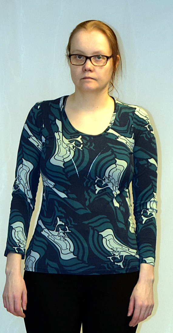 | Tästä kuvasta huomaa hyvin, että sovitusnuken lantio on liian leveä (vinot rypyt lantiolla). Lisäksi selkä on liian lyhyt, sillä poikkisauma tulee vyötärölle. |