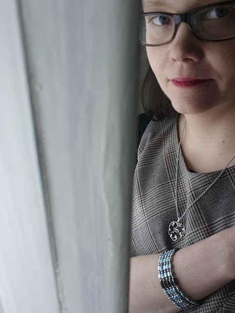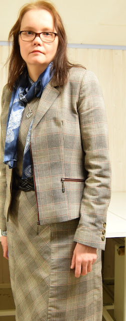 Tällä kertaa stailasin harmaan ruutujakun sinisillä asusteilla ja uusilla punaisilla huulilla.